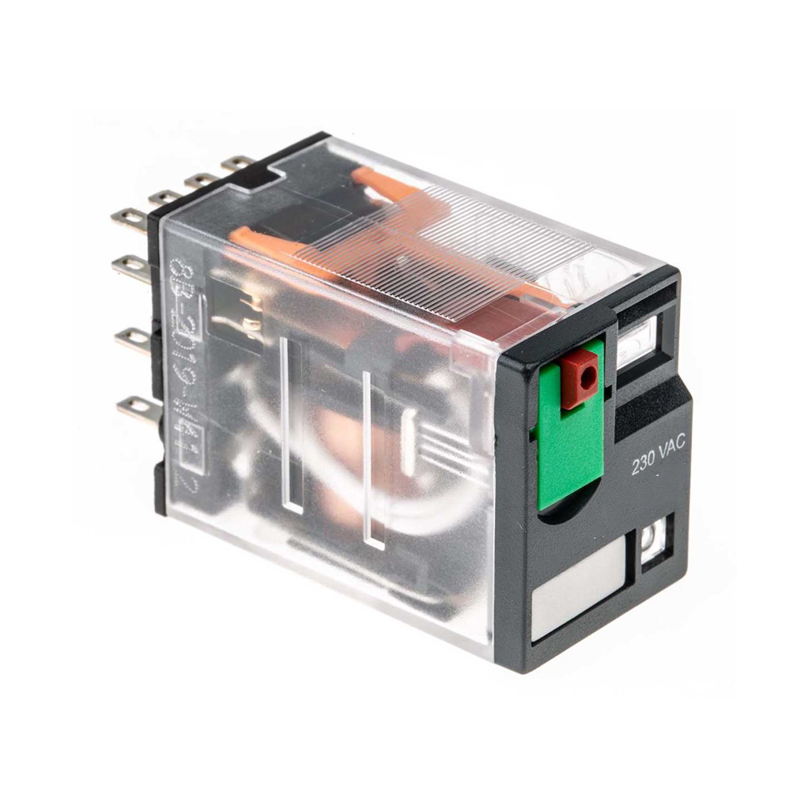 A 14-pin, 24V control relay is a 4PDT (four-pole, double-throw) electromagnetic switch designed for industrial automation, operating with a 24V DC or AC coil to switch four independent circuits simultaneously. It features 12 contact terminals and 2 coil terminals, typically supporting 5A-6A loads, often with an LED indicator in a plug-in, DIN-rail mounted plastic housing.